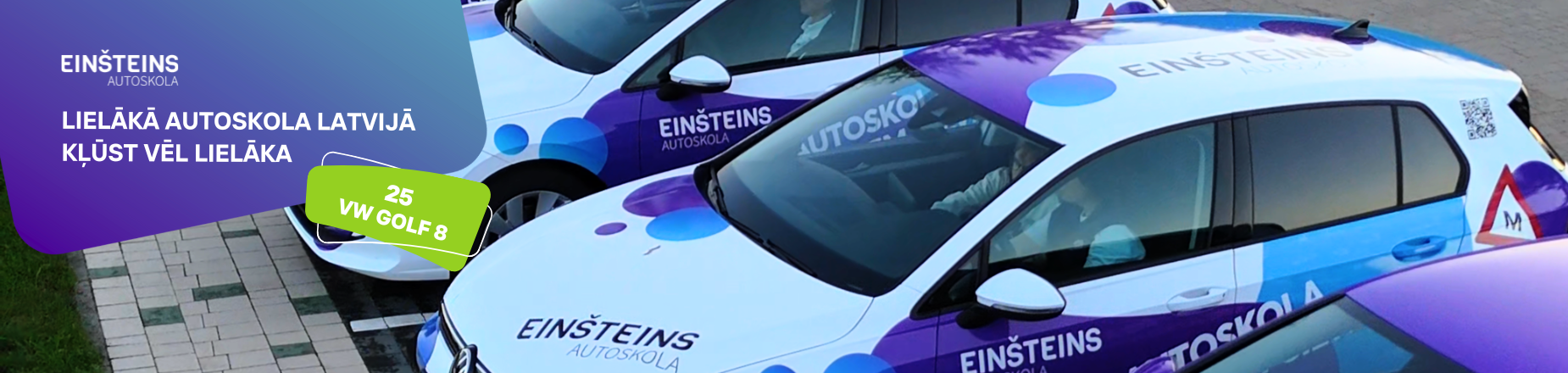 Latvijas lielākā autoskola kļūst vēl lielāka – tagad mūsu audzēkņiem visā Latvijā mācībām pieejamas jau 120 mūsdienīgas automašīnas, identiskas tām, ar kurām notiek CSDD vadīšanas eksāmens. “Einšteins” ir vienīgā autoskola Latvijā, kuras kursanti apgūst braukšanas prasmes ar visjaunāko autoparku – tajā pieejami gan elektroauto, gan automašīnas ar manuālo un automātisko pārnesumkārbu.